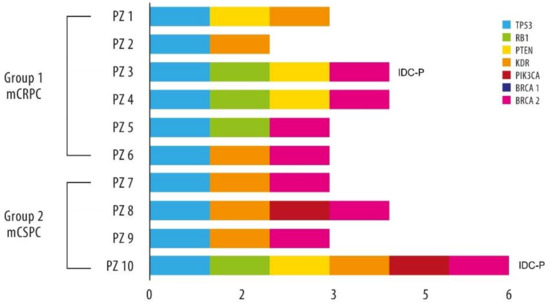 - Abida, W.; Armenia, J.; Gopalan, A.; Brennan, R.; Walsh, M.; Barron, D.; Danila, D.; Rathkopf, D.; Morris, M.; Slovin, S.; et al. Prospective genomic profiling of prostate cancer across disease states reveals germline and somatic alterations that may affect clinical decision making. JCO Precis. Oncol. 2017, 2017, PO.17.00029. [Google Scholar] [CrossRef]