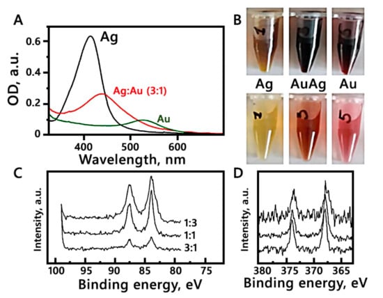 Panel (A) shows absorption spectrum of Ag, Au and AgAu NPs. Panel (B) shows Ag, Au and AgAu samples before (upper part) and after (lower part) dilution. Panels (C,D) show high-resolution XPS spectra of the series of bimetallic AgAu colloids, (AgAu(3:1), which was used in this study, AgAu(1:1) and AgAu(1:3)) in the range of Au and Ag (D).