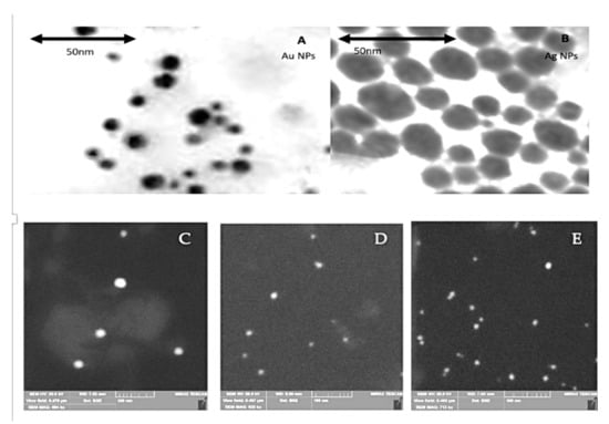 Electron microscopy images. Panels (A,B) show TEM images of Au and Ag NPs respectively. Panels (C–E) show SEM images of Ag, AgAu and Au NPs respectively. Panels (C–E) are reprinted with permission [19].