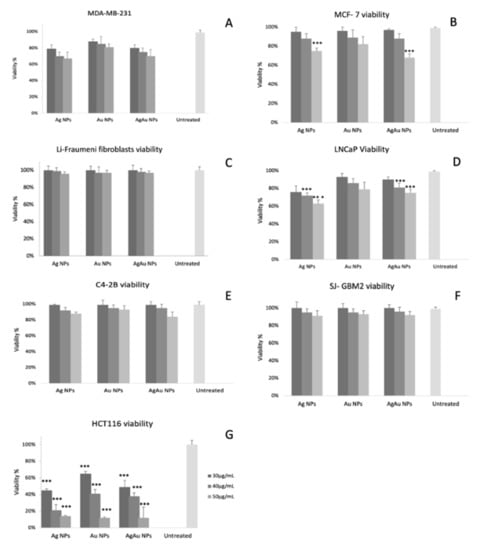 Viability percentage of all cancer cell lines (MDA-MB-231, MCF-7, fibroblasts derived from Li-Fraumeni patients, LNCaP, C4-2B, SJ-GBM2 and HCT116) in panels (A–G) respectively, incubated with NPs (Ag NPs, Au NPs, AgAu NPs) for 23 h. The *** symbol shows statistical significance using one way ANOVA (p < 0.05) compared to untreated cells.