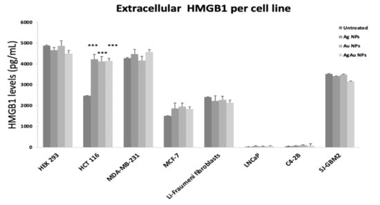 As indicated by the extracellular levels of HMGB1 (Figure 4), the most notable difference was detected in HCT116 cells. Incubation with Ag NPs, Au NPs, and AgAu NPs led to an increase of approximately 60% (compared to untreated cells) of extracellular HMGB1 levels. A more subtle increase was observed for MDA-MB-231 and, MCF-7 cells (almost 10% for AgAu NPs). The non-cancerous cell line HEK293 and the rest of the cancerous cell lines did not show altered levels following NP exposure.
