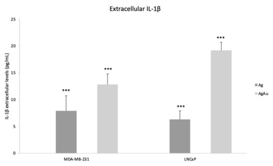Extracellular levels of IL-1β per cell line, after incubation with 50 μg/mL of Ag, AgAu of MDA-MB-231 and LNCaP cells. The *** symbol shows statistical significance using one way ANOVA (p < 0.05) compared to untreated cells. In every other cell line and conditions (Ag, Au and AgAu NPs and no NP treatment), no extracellular IL-1β was detected.