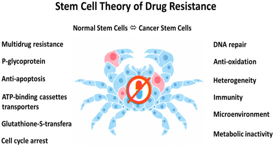One way to elucidate chemoresistance vs. chemosensitivity is to investigate their mechanisms of action in the context of a stem cell theory of cancer. When drug resistance involves stem-like properties or pathways in both normal and cancer stem cells, it is consistent with a stem cell origin of drug resistance [8,9,10,11,12,13,14,15,16,17]. When cancer stem cells (CSCs) are innately endowed with MDR capabilities in the form of ATP-binding cassette (ABC) transporters, anti-apoptotic mechanisms, glutathione-S-transferase (GST) expressions, they are inherently resistant to many standard and novel therapies and are naturally predisposed to tumor regrowth and relapse.