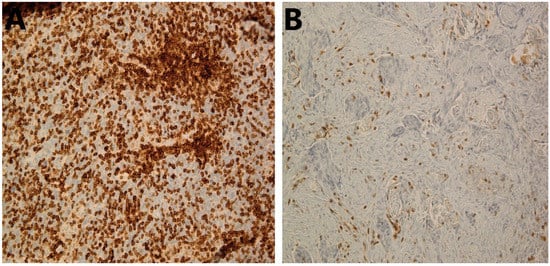 Evidence on the prognostic significance of TILs in patients with HNSCC has been rapidly accumulating in recent years. The selection of the molecule, e.g., CD3 (Figure 1), to be analyzed or relying on an overall assessment of TILs (Figure 2) without specific immunostaining is still a point of discussion, and there is no definitive conclusion. On the other hand, the recently published guidelines of the International Immuno-oncology Biomarker Working Group (IIBWG) [,] have been utilized in several studies, forming an essential step towards a standardized assessment method and implementation of TILs in routine pathology reporting. Of note, the introduced guidelines have been successfully used in head and neck cancer studies that assessed TILs in hematoxylin and eosin (HE)-stained slides [,,,].