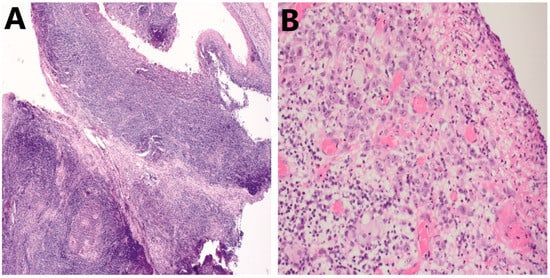 - Differentiating TILs from a pre-existing immune infiltrate and other immune cells. First, this can be attributed due to the presence of pre-existing lymphoid tissue (Figure 3A), not only in the oropharyngeal/tonsillar region but in all (sub)sites of the head and neck region. Therefore, distinguishing tumor-attracted from pre-existing mononuclear cells may be challenging. Second, regions with ulcerations (Figure 3B) or erosions are seeded with infiltrating immune cells that are predominantly polymorphonuclear cells, which can also hamper the correct assessment of TILs in the TME. Evidently, these should be excluded from evaluation.