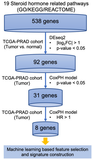 To identify the targeted genes related to cancer progression, Cox proportional hazard regression is traditionally well-accepted as the standard algorithm for survival analysis. However, in these high-throughput datasets, the number of variables is substantially higher than the number of samples. Compared to traditional regression statistics, machine learning (ML) algorithm has shown the ability to detect the key features predicting cancer prognosis from these complex datasets [15], and although ML has been applied to detect prognostic factors of PC in a few studies [16], none of them have focused on the genes in regulating the steroid hormone pathways, which are very important for PC morphology and progression. In the present study, we aimed to identify steroid hormone pathway-associated genes contributing to the progression and survival of PC by analyzing the data in several datasets using ML algorithm. In addition, the identified gene signature was further validated through external PC cohorts and analyzed using functional annotation to illustrate the regulatory pathways of these key steroid hormone-associated genes. These findings will help us more understand the underlying mechanism of CRPC and provide a potential target to develop specific therapies.