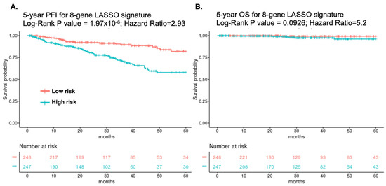 Progression-free interval (PFI) and overall survival (OS). Kaplan–Meier curves for (A) 5-year progression-free interval and (B) 5-year overall survival of the 8-gene signature. Patients were dichotomized into the “Low risk” group and the “High risk” group according to the 8-gene signature scores. The number of patients of the two risk groups in different following time in month were shown in the bottom tables of KM plots, respectively.