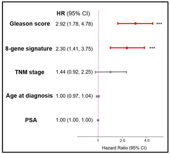 Multivariate analysis for progression-free interval. Multivariate Cox regression of the 8-gene signature with clinical variables. Significance levels are annotated. Clinical factors such as gleason score, psa level, tumor TNM stage, and age at diagnosis were considered as confounding variables in the analysis. Both hazard ratios and 95% confidence intervals were shown in the forest plot and factors reached a significant level were plotted in red. *** p-value < 0.001.