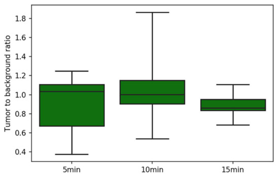 As stated, in three non-exophytic GIST lesions, no intraoperative TBR was calculated. Furthermore, due to a technical error, no static images were available for analysis in patient number 4. As a result, seven lesions were semi-quantitatively analyzed at separate timepoints after ICG administration (Figure 2). The median TBR for all the lesions at all the timepoints was 1.0, and all the TBRs ranged from 0.4 to 1.9. The median TBRs were 1.0 at 5 and 10 min after ICG administration, and 0.9 at 15 min after ICG administration. The corresponding ranges were 0.4–1.2, 0.5–1.9, and 0.7–1.2 for 5, 10, and 15 min after ICG administration, respectively. The highest TBR was found in patient number 1, which corresponds to the qualitative intraoperative evaluation observed in this patient. The two lesions in which nearly no fluorescence was observed, in both the GIST and surrounding tissue, had the lowest TBRs.