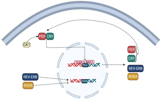 Although other studies have reported that PER1, PER2, CRY1, and CRY2 play a crucial role in regulating the circadian clock rhythm, PER3 has no circadian phenotype; in the second primary cycle, the translated proteins of CRY and PER classes form heteromultimeric complexes in the cytoplasm and are transported to the cell nucleus, which negatively regulates the activation of CLOCK/BMAL1 (NPAS2) heterodimers [11,12]. These positive and negative ITTFs circulate with a circadian periodicity of approximately 24 h. In this process, casein kinase 1 (CK-1) [13] limits the negative feedback potential of PER and CRY through degeneration or phosphorylation. The ITTF, as mentioned earlier, is a CLOCK/BMAL1 heterodimer, driving the rhythmic transcription of the nuclear receptor, REV-ERB, and retinoic acid-related orphan receptors (RORs) [14] subfamilies binding to E boxes in their promotional genes. RVE/ERB-α/β and ROR-α/β can regulate BMAL1 transcription. This molecular mechanism is shared in the brain and peripheral organ systems and forms a circadian network spanning the entire body [11,12,15].
