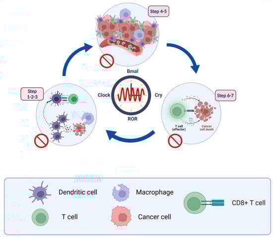 The circadian clock acts as a gate, controlling many aspects of cancer-related immune functions, including the release and presentation of antigens to cancer cells, initiation and activation of immune effector cells, trade and infiltration, immunity to tumors, and elimination of tumor cells (Figure 3).