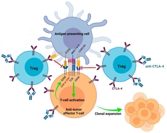 In addition, an increase of Tregs in PBMCs was observed in pancreatic cancer, metastatic renal cell carcinoma, and metastatic melanoma patients following anti-CTLA-4 treatment. These PBMC-derived Tregs maintained their suppressive function in vitro while activation markers CD25, CD49, HLA-DR, and CD45RO were increased on effector T-cells [71,72,73]. In colorectal cancer mouse models, anti-CTLA-4 depletes intra-tumoral Tregs but enhances the proliferation and number of Tregs in the spleen, non-draining lymph nodes, and tumor-draining lymph nodes [53,71]. The conflicting evidence of Treg depletion versus expansion in response to anti-CTLA-4 may be due to the disruption of the CTLA-4/CD28-dependent feedback loop used by Tregs to regulate its expansion and the heterogenous expression of CTLA-4 on Tregs.