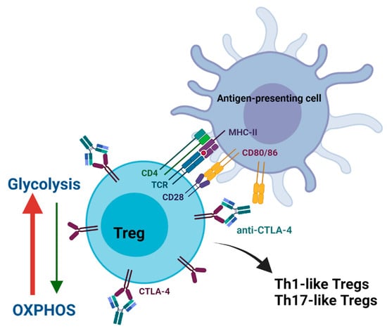 Metabolic alteration of Tregs may also induce Th17-like Tregs where IL17+FOXP3+CD4+ T-cells have been identified in the TME [88,89,90,91,92]. Th17 cells are the primary producers of IL-17 and are involved in autoimmune conditions. Blocking CD80/86-CTLA-4 interactions promote Th17 differentiation and autoimmune disease development [93]. Th17 cells are similar to Tregs in terms of plasticity as they can acquire Treg-like characteristics such as the expression of CTLA-4, IL-10, TGF-β, CD25, and FOXP3 [88,90,94]. FOXP3 expression will promote Treg differentiation by suppressing RORγt expression unless IL-6 is present to overcome this suppression to promote Th17 differentiation [95]. In addition to T-cell differentiating cytokines, metabolic fate is critical for development and differentiation of Tregs and Th17 cells. Th17 differentiation requires increasing glycolysis through mTORC signaling and HIF1α expression. In comparison, FOXP3 expression in Tregs suppresses mTORC activation and HIF1α expression in preference of OXPHOS (Figure 3) [89].