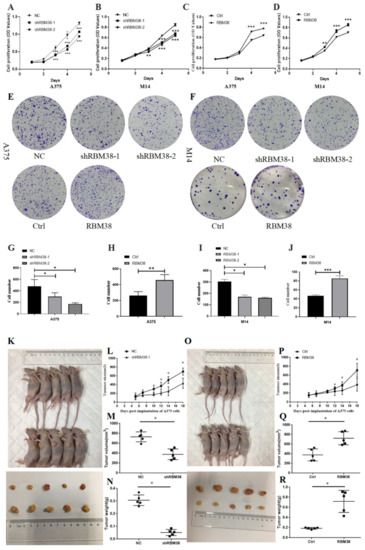 RBM38 promoted melanoma cell proliferation in vitro and vivo. (A–D) In A375 and M14 cells, the CCK-8 assay exhibited the effect of overexpression and downregulation of RBM38 on cell proliferation (data are shown as the mean ± SD of three replicates). (E–J) In A375 and M14 cells, colony formation assays exhibited the effect of overexpression and downregulation of RBM38 on cell proliferation. (Data are shown as the mean ± SD of three replicates). (K–N) Knockdown of RBM38 expression significantly inhibited melanoma cancer cell growth in nude mice and tumor volume weight was significantly reduced in the sh-RBM38 group compared to that in the NC group (there are five mouse tumors in each group). (O–R) Overexpression of RBM38 expression significantly increased melanoma cancer cell growth in nude mice and tumor volume weight significantly increased in the RBM38 group compared to that in the Ctrl group (there are five mouse tumors in each group) (for statistical comparison between two independent experimental groups (Student’s t-test) and among more than two experimental groups (ANOVA test), appropriated statistical tests were assayed. * p < 0.05, ** p < 0.01, *** p < 0.001).