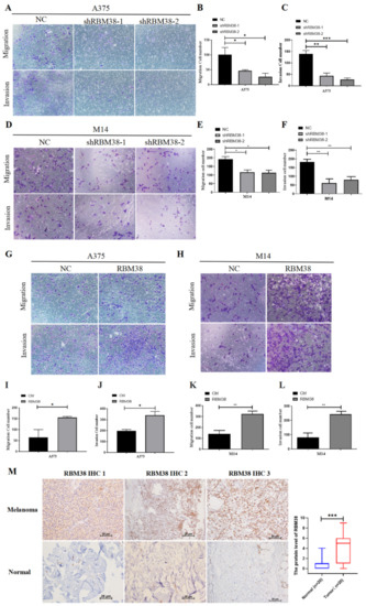 RBM38 promoted melanoma cell migration in vitro and in vivo and is highly expressed in melanoma tissues. (A–F) Effects of RBM38 knockdown on cell invasion and migration by cell invasion and migration assay in A375 and M14 cells (data are shown as the mean ± SD of three replicates). (G–L) Effects of RBM38 overexpression on cell invasion and migration by cell invasion and migration assay in A375 and M14 cells (data are shown as the mean ± SD of three replicates). (M) Representative images and statistical graphs of RBM38 staining in melanoma and normal tissues (n = 20, *** p < 0.001) by IHC staining. Scale bars indicated 25 μm. (For statistical comparison between two independent experimental groups (Student’s t-test) and among more than two experimental groups (ANOVA test), appropriated statistical tests were assayed. * p < 0.05, ** p < 0.01, *** p < 0.001).