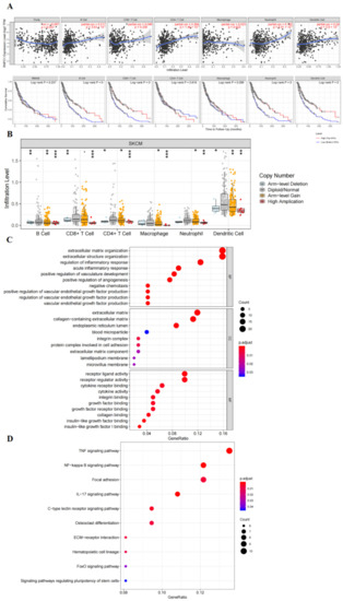 The association between immune cells and RBM38 expression in malignant melanoma was analyzed with the Tumor Immune Estimation Resource (TIMER; cistrome.shinyapps.io/timer (accessed on 17 September 2021)) database. It was found that RBM38 was related to tumor purity (r = −0.097, p = 0.037), B cell infiltration (r = 0.271, p < 0.001), CD4+ T infiltration (r = 0.264, p < 0.001), neutrophil infiltration (r = 0.132, p = 0.005), and dendritic cell infiltration (r = 0.24, p < 0.001) (Figure 4A). RBM38 CNV was found to be strongly related to immune infiltration in malignant melanoma, containing CD4+ T cells, CD8+ T cells, B cells, neutrophils, macrophages, and dendritic cells (Figure 4B). These results demonstrate that RBM38 may be correlated with immune cell infiltration in the TME of malignant melanoma. Given this connection, it is relatively evident that the immune pathway may be involved in tumor initiation and progression. Therefore, further detailed experiments were conducted to prove this speculation.