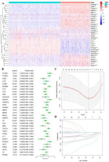 The expression pattern of RBM38-related immune genes in the training cohort and construction of prognostic risk signature. (A) The expression pattern of RBM38-related immune genes in the training cohort (* p < 0.05, *** p < 0.001). (B) RBM38-related immune genes were assessed by univariate Cox analysis in the training cohort. (C,D) LASSO Cox regression analysis of the chosen 17 RBM38-related immune regulators(* p < 0.05, *** p < 0.001).