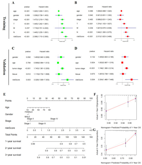 Independent prognostic factors in the validation and training cohorts. (A,B) Univariate and Multivariate Cox analyses of the risk score of our prognostic signature and clinicopathological parameters in the training cohort. (C,D) Univariate and Multivariate Cox analyses of the risk score of our prognostic signature clinicopathological parameters in the validation cohort. (E) Prognostic nomogram for malignant melanoma patients. (F,G) Calibration curves for the 1- and 3-year nomogram.