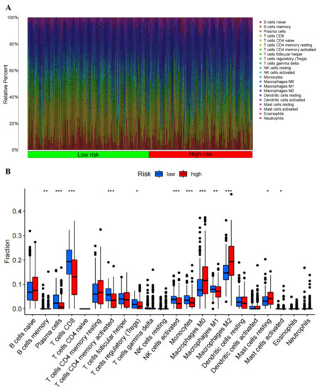 The immune infiltration of malignant melanoma patients with high and low-risk scores and the correlation between immune cell infiltration and risk score. (A) Bar plot demonstrating the relative proportion of 22 types of infiltrating immune cells in malignant melanoma patients with a high and low-risk score. (B) Box plot demonstrating the ratio differences of 22 types of immune cells in malignant melanoma patients with a high and low-risk score (* p < 0.05, ** p < 0.01, *** p < 0.001).