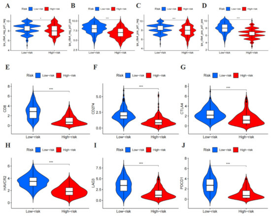 Immunosuppressed molecules and therapy associated with the signature-based risk score. (A–D) Immunophenoscore comparison between high-risk and low-risk groups in malignant melanoma patients in the PD-1 negative/positive or CTLA4 negative/positive groups. PD1 positive or CTLA4 positive represented anti-PD-1/PD-L1 or anti-CTLA4 therapy, respectively. (E) CD8, (F) CD274, (G) CTLA4, (H) HAVCR2, (I) LAG3, and (J) PDCD1 levels, the low-risk group was found to be positively correlated with upregulated, showed significant statistical difference in patients with melanoma. (* p < 0.05, *** p < 0.001).
