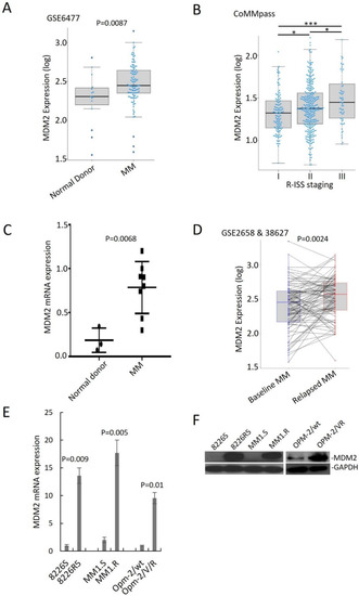 MDM2 overexpression is associated with advanced staging, disease relapse and poor outcomes in MM patients. (A) MDM2 expression in normal donor, newly diagnosed MM, and relapsed MM (GSE6477; ND n = 15, newly diagnosed MM n = 73). (B) Baseline MDM2 expression in different clinical stages of MM (CoMMpass; R-ISS-I n = 128; R-ISS-II n = 318; R-ISS-III n = 60). R-ISS-I vs. R-ISS-II, p = 0.029; R-ISS-II vs. R-ISS-III, p = 0.01, R-ISS-I, vs. R-ISS-III, p < 0.0001. (C) qRT-PCR quantification of MDM2 mRNA from CD138+ cells of three normal donors and eight MM patients. Results are presented as mean ± SD of three independent experiments. (D) MDM2 expression before and after relapse in paired MM samples (GSE2658 expression at diagnosis; GSE38627 expression at relapse; n = 88). (E) qRT-PCR for MDM2 expression in paired drug-sensitive (8226S, MM1.S and OPM-2/wt) and drug-resistant (8226R5, MM1.R and OPM-2/VR) MM cell lines. Results are presented as mean ± SD of three independent experiments. (F) Western blot for MDM2 expression in paired drug-sensitive (8226S, MM1.S and OPM-2/wt) and drug-resistant (8226R5, MM1.R and OPM-2/VR) MM cell lines. The uncropped blot is in Supplemental Figure S12. *, p < 0.05; ***, p < 0.001.