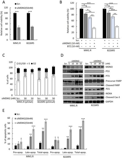 Knockdown of MDM2 induces growth inhibition, apoptosis and cell cycle arrest in drug resistant MM cells. (A) Cell viability of MM1.R and 8226R5 cells after 48 h transfection with scrambled siRNA (Scr) or siMDM2 (50 nM). (B) Cell viability of MM1.R and 8226R5 cells after 24 h transfection with scrambled siRNA (Scr) or 10 nM siMDM2 followed by 24 h treatment with 10 nM BTZ or drug vehicle. Results are presented as mean ± SD of three independent experiments. (C) Bar plots indicate the distribution of cells in each cell cycle phase for MM1.R (p53wt) and 8226R5 (p53null) after 48 h transfection with scrambled siRNA (Scr) or different concentrations of siMDM2, as indicated. Results are presented as mean ± SD of three independent experiments. (D) Western blot of cell lysates from MM1.R and 8226R5 cells after 48 h transfection with scrambled siRNA (Scr) or siMDM2. The uncropped blot is in Supplemental Figure S13. (E) Apoptosis assay using flow cytometry after staining with annexin V-FITC/propidium iodide. Bar plots indicate the percentage of pro/early apoptotic, late apoptotic and total apoptotic cells for MM1.R and 8226R5 after 48 h transfection with scrambled siRNA (Scr) or different concentrations of siMDM2, as indicated. Results are presented as mean ± SD of three independent experiments. *, p < 0.05; **, p < 0.01, ***, p < 0.001.