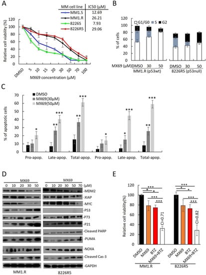 3.3. MX69 Inhibits the Growth of Drug-Resistant MM Cells through Induction of p53-Dependent and Independent Pathways