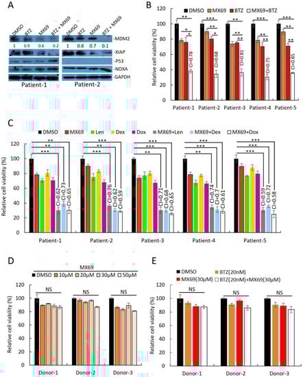 Combination of MX69 with anti-myeloma drugs show synergistic effects on MM patient samples. (A) Western blot of cell lysates from MM patient PBMCs after 48 h treatment with DMSO or single/combination treatment with 20 μM MX69 and 10 nM BTZ. MDM2 protein densitometry measured through normalized GAPDH. The uncropped blot is in Supplemental Figure S15. (B,C) Cell viability of CD138+ cells from MM patients after 48 h treatment with DMSO or single/combination treatment with 20 μM MX69, 10 nM BTZ 5 μM Len, 10 μM Dex, and 1 μM Dox. Results are presented as mean ± SD of three independent experiments. (D) Cell viability of normal donor PBMCs after 48 h treatment with DMSO or different concentrations of MX69, as indicated. Results are presented as mean ± SD of three independent experiments. (E) Cell viability of normal donor PBMCs after 48 h treatment with DMSO or single/combination treatment with 30 μM MX69 and 20 nM BTZ, as indicated. Results are presented as mean ± SD of three independent experiments. *, p < 0.05; **, p < 0.01, ***, p < 0.001.