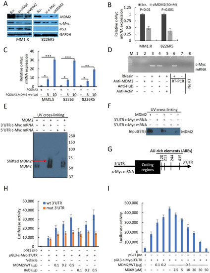 To investigate whether MDM2 protein can directly bind to and stabilize c-Myc mRNA, we performed a protein–RNA binding assay to search for possible physical associations between MDM2 protein and c-Myc mRNA. After pulldown of MDM2 or mRNA binding protein like HuD [28] and RT-PCR, revealed that MDM2, like HuD, was able to bind to c-Myc Mrna (Figure 5D). Since MDM2 protein binds either the 3′UTR or 5′UTR mRNA sequence to regulate gene expression at the translational level, we further investigated whether MDM2 binds specifically to the c-Myc 3′UTR or 5′UTR. We performed UV crosslinking of c-Myc 3′UTR or 5′UTR probes with MDM2 protein for gel shift assay. Results indicated that 3′UTR c-Myc mRNA showed greater shift with MDM2 protein compared to 5′UTR c-Myc RNA suggesting that MDM2 binds to the 3′UTR of c-Myc mRNA (Figure 5E). To further confirm that MDM2 binds specifically to the 3′UTR of c-Myc mRNA, we performed UV-crosslinking of UTP-biotinylated c-Myc 3′UTR and 5′UTR RNA probes with 8226R5 cells extracts. RNA-protein complexes that were pulled down revealed that MDM2 binds to the c-Myc 3′UTR RNA probe, but not to the c-Myc 5′UTR RNA probe (Figure 5F). To rule out the possibility that MDM2 binds to c-Myc mRNA through its interaction with endogenous HuD in extracts, we performed co-immunoprecipitation and found no binding interaction between MDM2 and HuD (Supplemental Figure S8B).