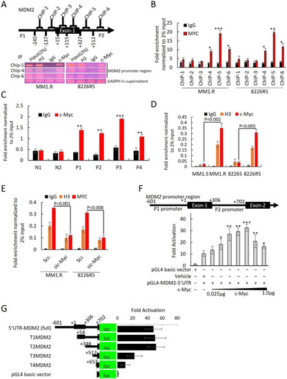 To identify potential c-Myc regulatory sites, we performed ChIP assay. We focused on a ~1300 bp region on the MDM2 promoter that covered all four predicted c-Myc binding motifs. Six primer ChIP pairs (ChIP-1 to ChIP-6) were designed to cover this region (Supplementary Table S1). After immunoprecipitation of c-Myc-bound DNA in MM1.R and 8226R5, we found that ChIP5, which contained c-Myc binding motif 3, was enriched with c-Myc (Figure 6A). ChIP-qRT-PCR of c-Myc bound DNA found that only ChIP-5 was significantly more enriched with c-Myc compared to control (Figure 6B). To confirm that c-Myc binds to the MDM2 promoter in MM cells, we re-performed ChIP assay on four primary MM patient samples and two normal donor samples and found that c-Myc was enriched on the MDM2 promoter of MM patient samples but not normal donor samples, suggesting that c-Myc is involved in the upregulation of MDM2 in MM pathogenesis (Figure 6C). Furthermore, ChIP-qRT-PCR on paired drug-sensitive and drug-resistant MM cells revealed that the binding of c-Myc on the MDM2 promoter was significantly increased in drug-resistant MM cells, suggesting that c-Myc is involved in the upregulation of MDM2 in drug resistance (Figure 6D). Moreover, silencing of c-Myc in drug-resistant MM cells showed less c-Myc enrichment on the MDM2 promoter in comparison to control (Figure 6E). These results indicate that c-Myc binds to the MDM2 promoter in MM cells to regulate the expression ofMDM2. To confirm that MDM2 is a direct transcriptional target of c-Myc, we cloned the MDM2 promoter region (covering promoter regions 1 and 2) into the null promoter pGL4-basic vector and performed gene transfection and reporter assays. Co-transfection with various concentrations of c-Myc expression plasmid stimulated the MDM2 promoter-mediated luciferase activity in 293T cells, suggesting that c-Myc regulates MDM2 transcription (Figure 6F).