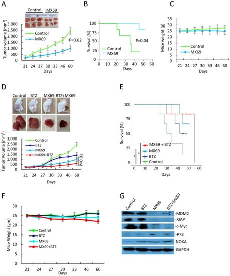 Finally, to examine if MX69 could further exert anti-myeloma effects with BTZ, we treated xenograft mice through intraperitoneal injection twice a week with 0.5 mg/kg BTZ alone, three times a week with 50 mg/kg MX69 alone or combined with 0.5 mg/kg BTZ, or an equal volume of vehicle for 21 days. Combination treatment with MX69 and BTZ was most effective at inhibiting tumor growth compared and resulted in prolonged survival compared to control or single agent treated animals (Figure 7D; on day 22 p = 0.012). (Figure 7E; MX69 + BTZ vs. vehicle control p = 0.027). When we examined isolated tumor tissues, immunoblotting demonstrated that MX69-treated groups had reduced expression ofMDM2, XIAP, and c-Myc and increased expression of pro-apoptotic factor NOXA (Figure 7G). In addition, treatment with MX69 and/or BTZ did not affect body weight, indicating the doses used for the treatment were tolerable to the mice (Figure 7C,F).