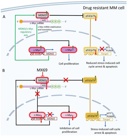 Targeting the MDM2/c-Myc regulatory axis in MM. (A) Proposed model of MDM2/c-Myc regulatory axis in MM. MDM2 binds c-Myc 3′UTR AU-rich elements (AREs) to promote c-Myc mRNA stabilization, and c-Myc drives transcription of MDM2 via binding E-box sequences in MDM2 promoter. As a result, MDM2 is upregulated and targets p53/p73 for proteasomal degradation, thereby preventing the induction of p21 and PUMA for stress-induced cell cycle arrest and apoptosis. In addition, c-Myc is upregulated and induces expression of cell proliferation genes. (B). MDM2 inhibitor MX69 disrupts the MDM2/c-Myc axis in MM. MX69-mediated downregulation of MDM2 results in the destabilization of c-Myc mRNA, leading to reduced expression of c-Myc protein and its transcriptional targets involved in cell proliferation. MX69-mediated downregulation of MDM2 also results in the accumulation of p53 and p73, leading to increased expression of its transcriptional targets such as p21 and PUMA for stress-induced cell cycle arrest and apoptosis.