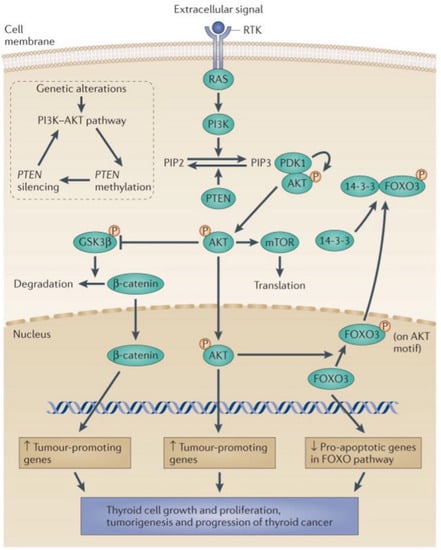 - Xing, M. Genetic Alterations in the Phosphatidylinositol-3 Kinase/Akt Pathway in Thyroid Cancer. Thyroid 2010, 20, 697–706. [Google Scholar] [CrossRef]