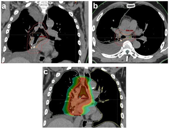 ESTRO/ACROP guidelines suggested that CTV should include the pathologically involved and resected mediastinal lymph node stations, bronchial stump, ipsilateral hilum and ipsilateral nodal stations 4 and 7. The definition of CTV depends on the lung lobe where the tumor was located, but the bronchial stump, ipsilateral hilum, positive lymph node regions and LN stations 4 and 7 must always be included in the CTV due to their high risk of relapse [83] (Figure 1).