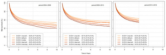 We calculated net survival according to Pohar–Perme. Net survival estimates how long after cancer diagnosis an individual would be alive if the only possible cause of death was cancer, i.e., cancer specific survival. This is achieved by inverse-probability weighting of person-time at risk, namely older individuals are assigned larger weights because they are more likely to die from other causes [15,16]. Because not every individual included in the analysis was followed-up for 5 years, the complete approach to survival estimation was used [17]. We reported 5-year net survival for the entire period as well as 10-year net survival for periods 2004–2008 and 2009–2013. Net survival is not presented for (sub)groups where there were less than 20 cases, and a number of cancer entities were excluded where most of the categories had less or around 20 cases. Analyses were performed with R software version 4.1.0 using the relsurv package version 2.2-6 [18]. The Cox proportional hazards regression model was applied for investigating the effect of socioeconomic deprivation on the survival of cancer patients [19]. In the multivariate Cox model, in addition to SI-EDI, the hazard ratios were adjusted for gender (males, females), period of diagnosis (2004–2008, 2009–2013, 2014–2018), age group at diagnosis (20–49, 50–74, 75–94) and stage at diagnosis (localized, regional, distant, or unknown extent of disease). In the analysis, the event was considered death by any cause. Cox modeling was performed using IBM SPSS Statistics Version 24 software. For calculating confidence intervals in the analyses, we used alpha 0.05.