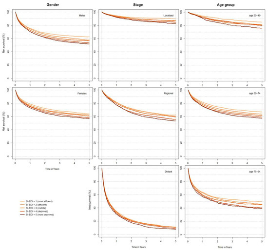 Figure 2 shows five-year net survival by SI-EDI categories stratified by gender, stage and age group at diagnosis. Women survived longer in all SES categories. Five-year net survival was 7 percentage points lower for the most deprived compared to the most affluent women. This difference was even larger in men—11 percentage points. The gaps between the five SI-EDI curves were even more pronounced for ten-year survival (Figure 1 and Tables S2 and S3). Survival of cancer patients diagnosed with distant metastases was low irrespective of SES, while there was a statistically significant difference between socioeconomically deprived and affluent patients diagnosed with localized (7 percentage points) or regionally advanced (9 percentage points) disease. There is no significant trend across SES categories in the survival of patients with unknown stages. A significant difference in survival between SI-EDI categories was also evident in all age groups—in the largest group of patients (aged 50 to 74 years at diagnosis), 66.8% (65.7–68.1%) of the most affluent patients survived five years, whereas survival in the most deprived group was only 57.2% (55.5–58.9%) (Figure 2).