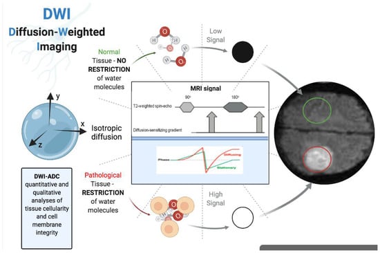 DWI provides quantitative information about tissue microstructure based on differences in water proton mobility and cell density assessment [87,88]. The random movement of water molecules is related to the extent of the cellularity of the tissue as well as to intact cell membranes, and the apparent diffusion coefficient (ADC) is a parameter for quantitative assessment [89,90] (Figure 2). Intravoxel incoherent motion (IVIM) assessment, a bi-exponential model for evaluating a DWI signal, enables the acquisition of the pure tissue coefficient (Dt), the pseudodiffusion coefficient (Dp), and the perfusion fraction (pf) [91]. Conventional DWI assessment is based on the theory that water diffusion in voxels obeys a Gaussian law [92]. In tissues, diffusion is affected by the presence of molecular obstacles and deviates from Gaussian law. To describe this deviation from the Gaussian distribution, a mathematical model known as diffusion kurtosis imaging (DKI) was proposed by Jensen et al. in 2005. The quantitative parameters extracted by DKI are the mean of the mean kurtosis coefficient (MK), which reflects the deviation of tissue diffusion from a Gaussian model, and the mean of the diffusion coefficient (MD), which assesses the correction for non-Gaussian bias [93,94].