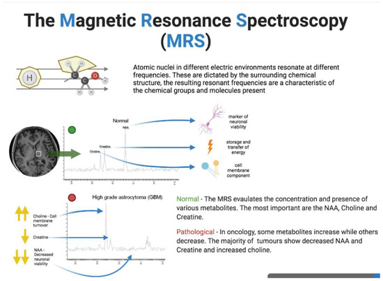 MR Spectroscopy (MRS) is an instrument that provides metabolic information through electromagnetic signals in the radiofrequency range generated by atomic nuclei in molecules [109]. Since the surrounding structures determine the electrical environment, the subsequent resonant frequencies affect the chemical groups and molecules present. MRS provides concentrations of some specific metabolites. However, there are still some open questions to be addressed by this tool [110].