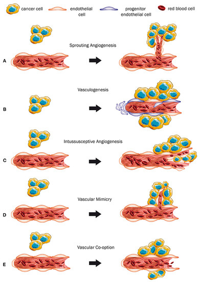 Different neovascularization types due to cancer. (A) Sprouting angiogenesis: growth of new capillary vessels out of preexisting ones. (B) Formation of primitive vascular structures during embryogenesis via the differentiation of endothelial precursor cells. (C) A dynamic intravascular process capable of dramatically modifying the structure of the microcirculation. (D) Formation of vascular structures by cancer cells, allowing to generate a channel-network able to transport blood and tumor cells. (E) Mechanism in which tumors obtain a blood supply by hijacking the existing vasculature and tumor cells migrate along the vessels of the host organ. (Permission by Haas G, Fan S, Ghadimi M, De Oliveira T, Conradi LC. Different Forms of Tumor Vascularization and Their Clinical Implications Focusing on Vessel Co-option in Colorectal Cancer Liver Metastases. Front Cell Dev Biol. 12 April 2021;9:612774. doi: 10.3389/fcell.2021.612774. PMID: 33912554; PMCID: PMC8072376).