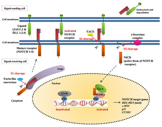The Notch gesturing lane enhances cell behavior. It is also fundamental limit in every primary cell-to-cell engagement stage. Besides, it does not take part in the coordination of pathway signaling, which requires the regulation of gene mechanism governing several processes in cell variation. In addition, cell fate has one of the vital roles in diverse procedures of embryogenesis, regeneration of cells and tissues, and organogenesis [12,13]. NECD-NTMIC is associated with singular Notch cellular receptor transmembrane proteins, including an extracellular, an intracellular area, and a transmembrane receptor. Mammals possess four types of NOTCH receptors (1, 2, 3 and 4). There exists endoplasmic reticulum in the Golgi bodies of cells receiving signals, for the receptor processing.