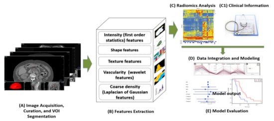 The term radiomics was coined from other “omics” terms such as genomics and proteomics by combining the words “radiology” and “omics”. Simply put, radiomics is the branch of high-throughput data mining research in radiology that involves extracting an array of hand-crafted quantitative features from medical images. As mentioned above, a typical radiomics workflow consists of several basic steps, which are depicted in Figure 3.