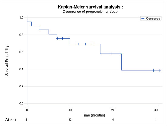 Kaplan–Meier survival analysis of occurrence of progression or death among the 21 patients. No missing data.
