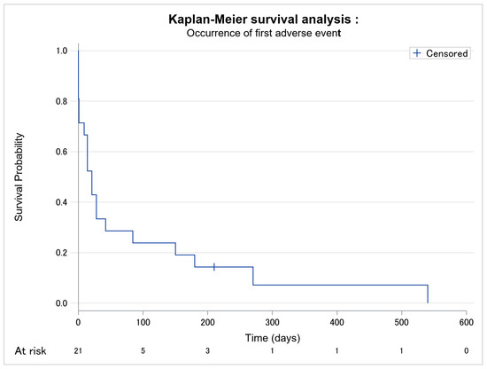 Kaplan–Meier survival analysis of occurrence of first all-grade adverse event among the 21 patients. No missing data.