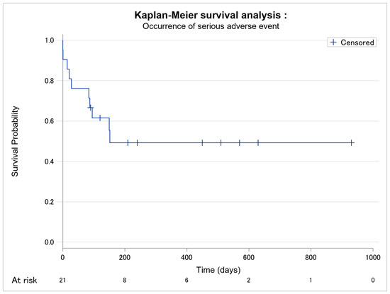 Kaplan–Meier survival analysis of occurrence of severe grade III–IV adverse event among the 21 patients. No missing data.