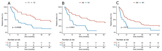 Cumulative probability of overall survival in the entire analyzed group of patients according to categories: (A) T; (B) N; (C) M.