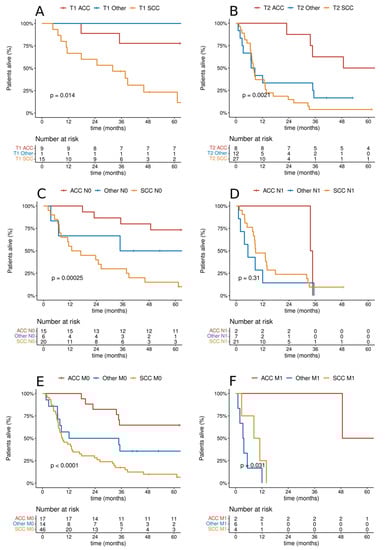 In the presented study, in a group of 71 evaluable patients, lymphadenopathy was found in 42.3% (ACC—2.8%, SCC—29.6%). In the total group of patients and in the group of patients treated radically, a significantly worse 5 year OS was demonstrated in the case of clinical lymph node involvement (general group 41.2% vs. 0%; radically treated group 65% vs. 0%). These results are consistent with the literature reports [,,,]. In the study by Bhattacharyya et al., the authors showed that the survival of patients with positive regional lymph nodes was more than 50% worse compared to patients with the N0 feature [].