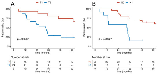 Cumulative probability of overall survival in the group of patients receiving radical treatment according to categories: (A) T; (B) N.