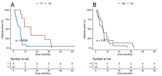 In the group of patients undergoing radical treatment, the differences in the T and N categories had an impact on OS. Among patients treated with radical intention, the 5 year OS in patients with T1 feature was 74.5%, and, in patients with T2 feature, it was 24.3%. The 5 year OS in patients with N0 and N1 categories was 65% and 0%, respectively, and the 3 year OS was 73.1% and 16.7%, respectively. In the group of patients treated with palliative care, only differences with regard to the T category were observed. The 5 year OS in patients with T1 and T2 categories was 0% and 4.4%, respectively. On the other hand, the 3-year OS was 22.2% and 4.4%, respectively, and the 1 year OS was 55.6% and 8.7%, respectively. Figure 4 and Figure 5 show the overall survival curves according to T and N depending on the treatment intention. Multivariate analysis revealed statistical significance for T feature both in the group of patients undergoing radical and in those receiving palliative treatment (Figure 6 and Figure 7).