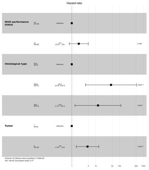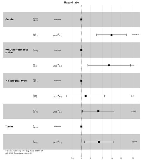 Multivariate analysis for overall survival among radically treated patients. Significant codes legend: from 0 to 0.001 “***”; from 0.01 to 0.05 “*”.