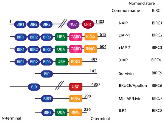 Schematic representation of the IAP family members’ structure. The nomenclature, length, and domains of the different proteins are shown. Abbreviations: BIR (Baculoviral IAP Repeat), NOD (Nucleotide-binding and Oligomerization Domain), LRR (Leucine Rich Repeat), UBA (Ubiquitin-Associated), CARD (Caspase-Associated Recruitment Domain), RING (Really Interesting New Gene), UBC (Ubiquitin-conjugating).